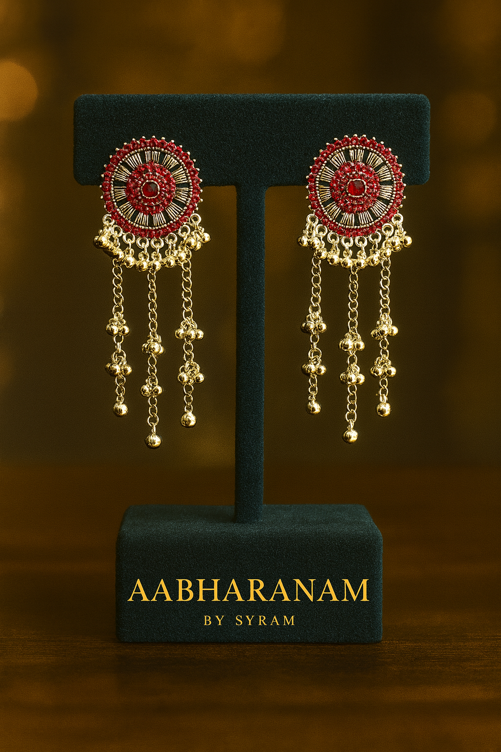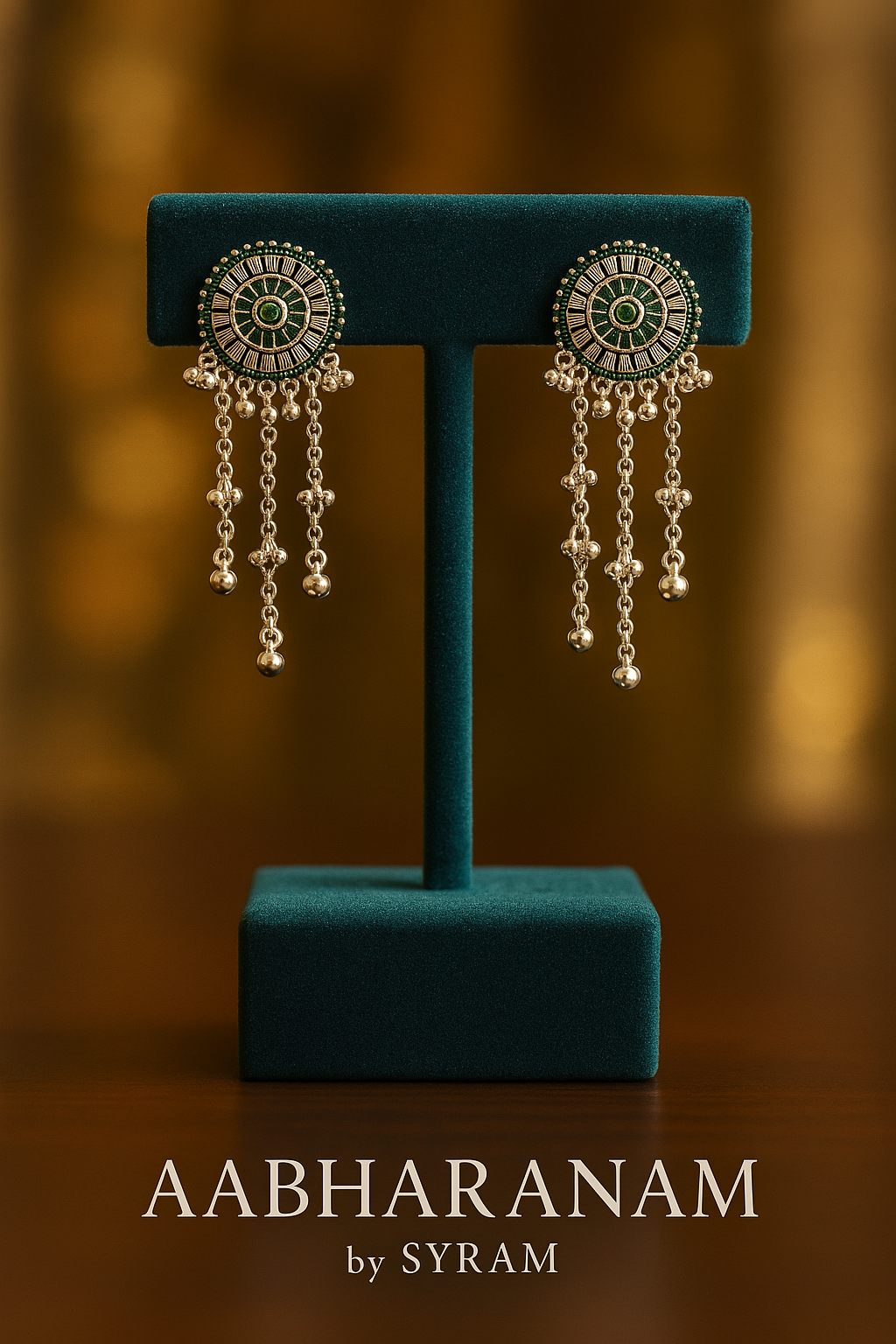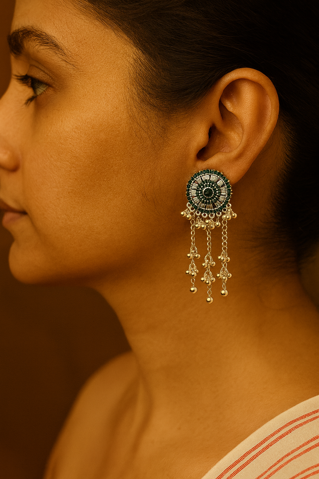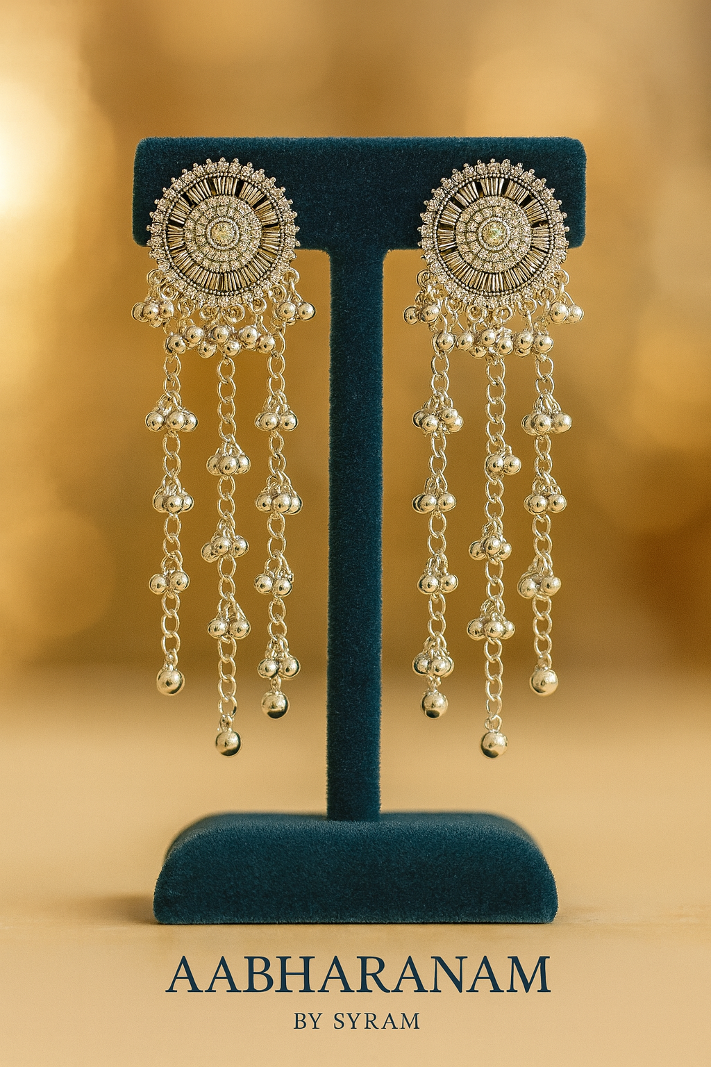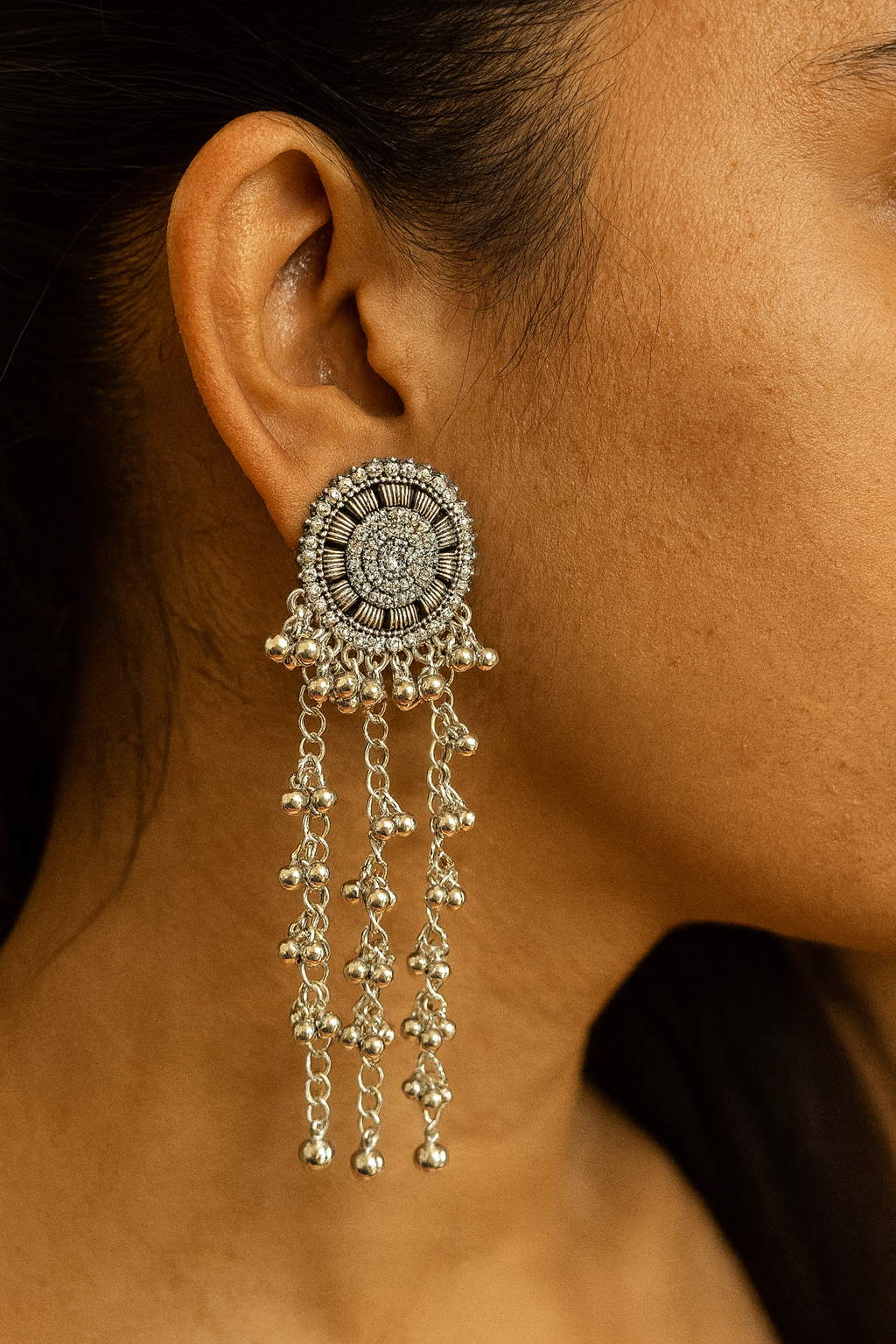 Design: Circular stud with intricate detailing & dangling chains