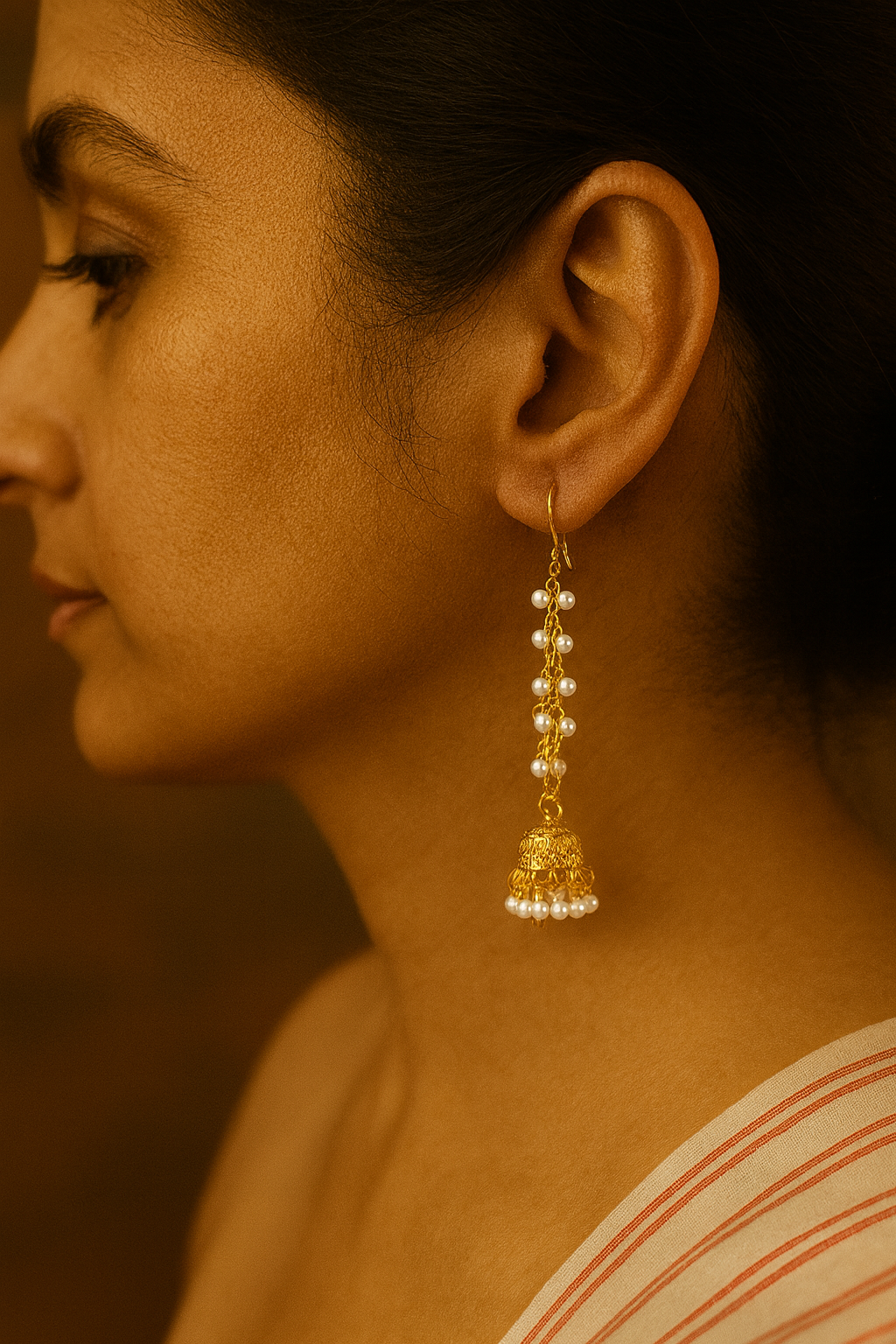 Long Gold-Plated Chain Jhumka Earrings with Pearl Clusters – Statement Ethnic Jewelry