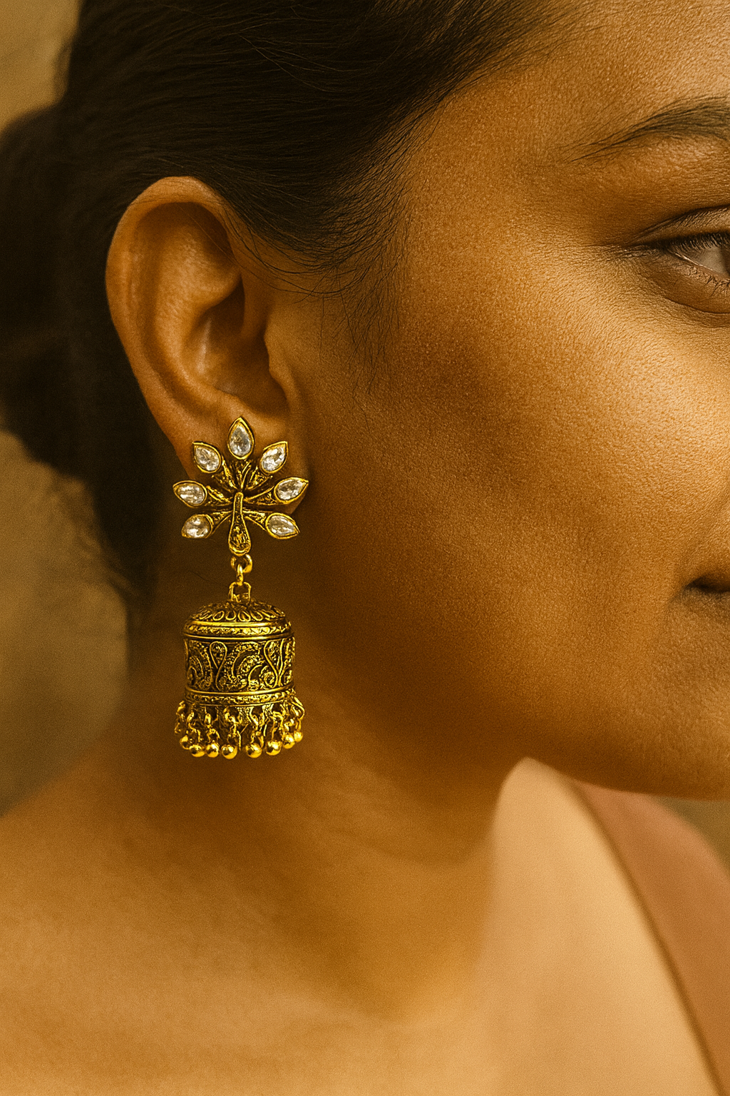 Design: Peacock stud with detailed stonework & antique finish jhumka