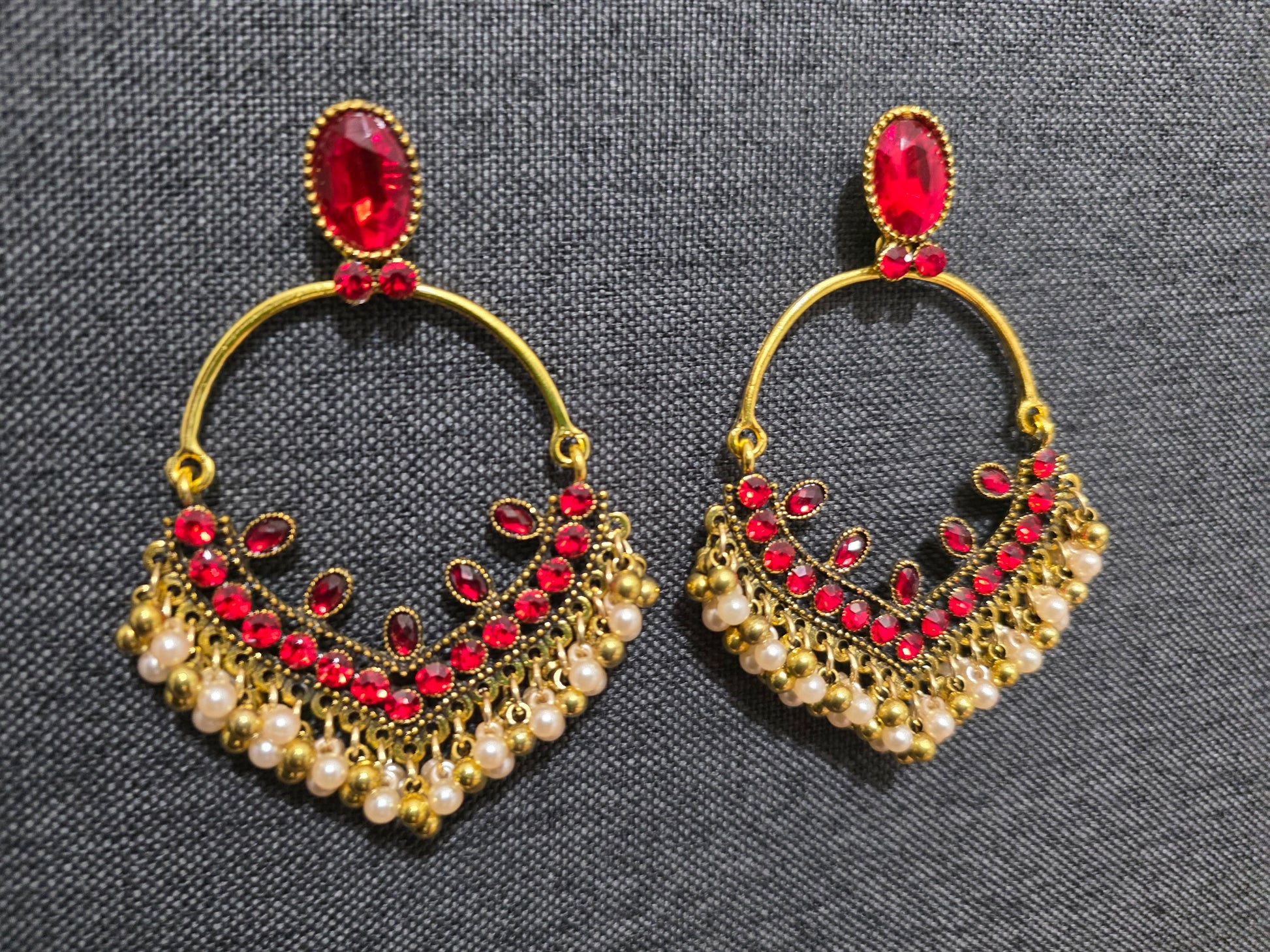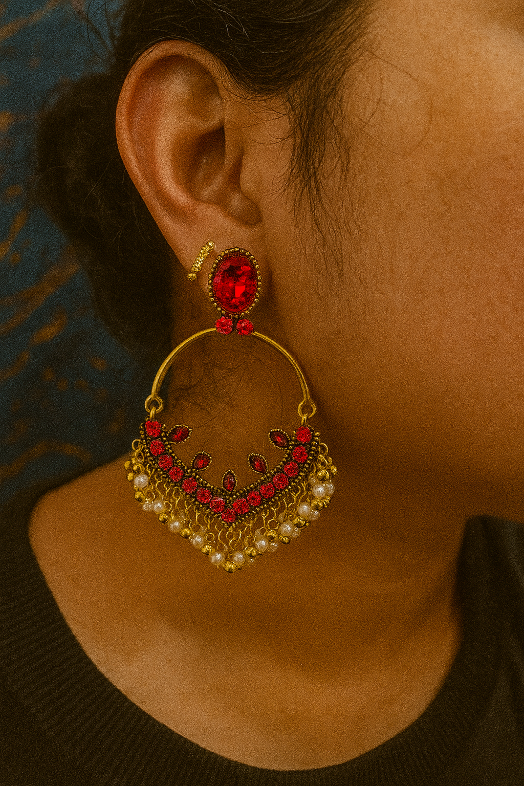 Shop stunning Royal Red Kundan & Pearl Statement Hoop Earrings. Gold-plated finish with dazzling red stones & pearl drops – perfect for weddings, parties & festive occasions. Free shipping on orders $30+.