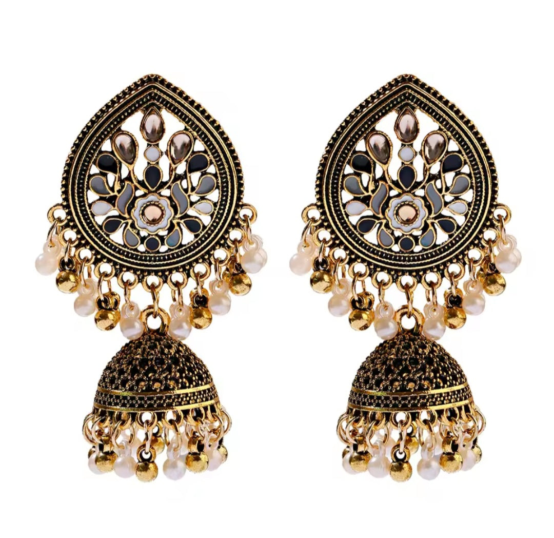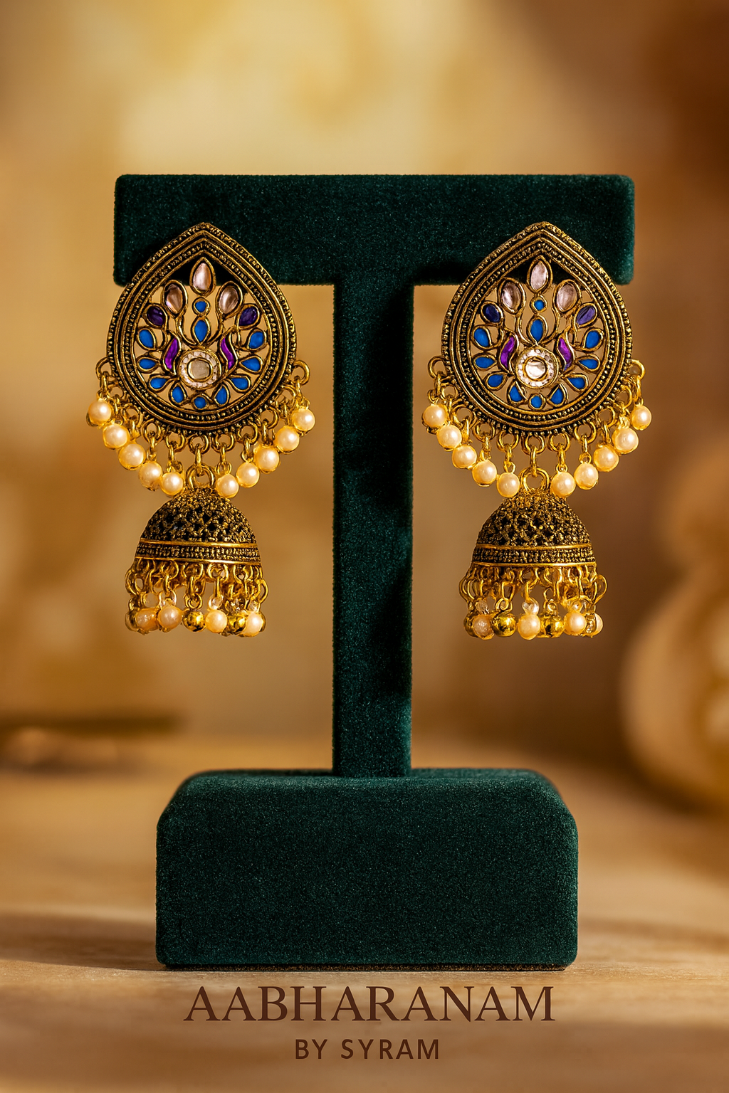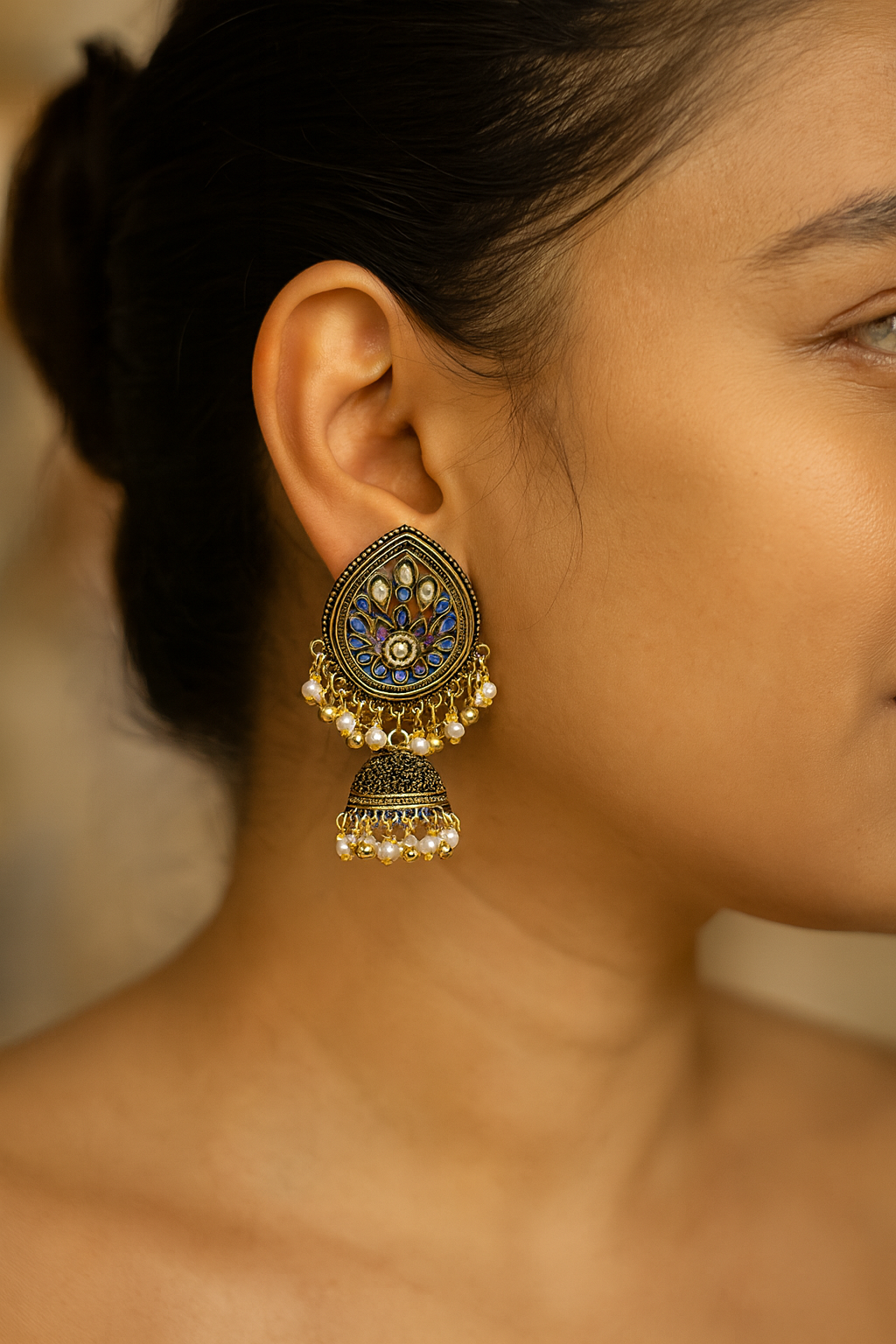 Teardrop Enamel Jhumka Earrings with Pearls – Blue, Multicolor & Black Variants