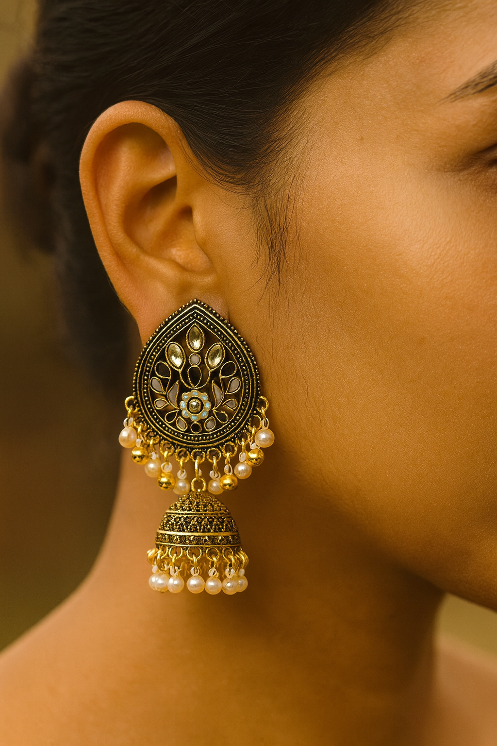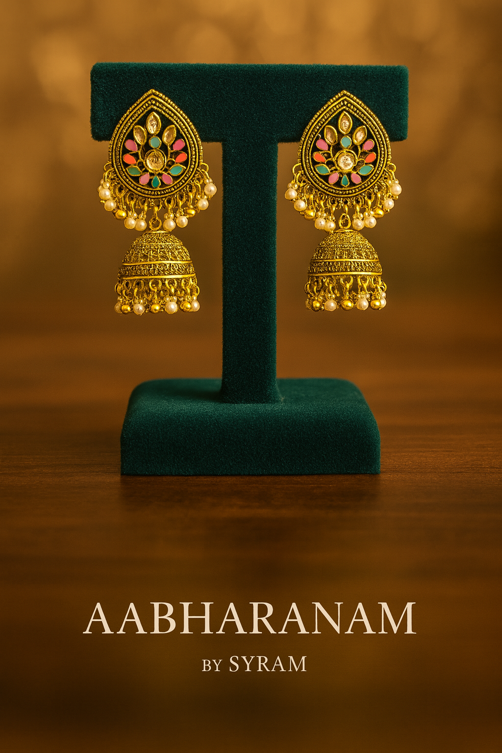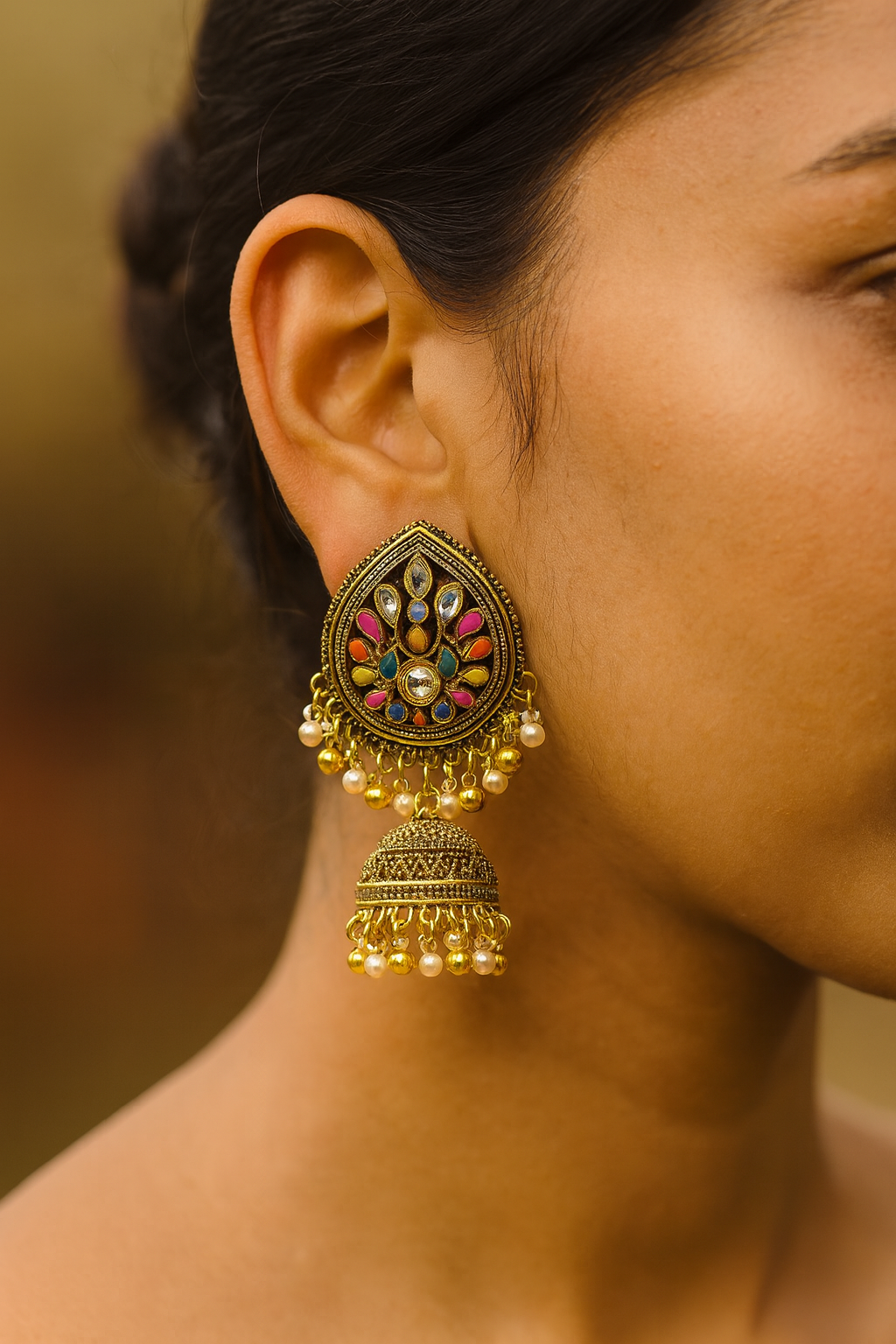Design: Teardrop enamel stud with dome-shaped jhumka