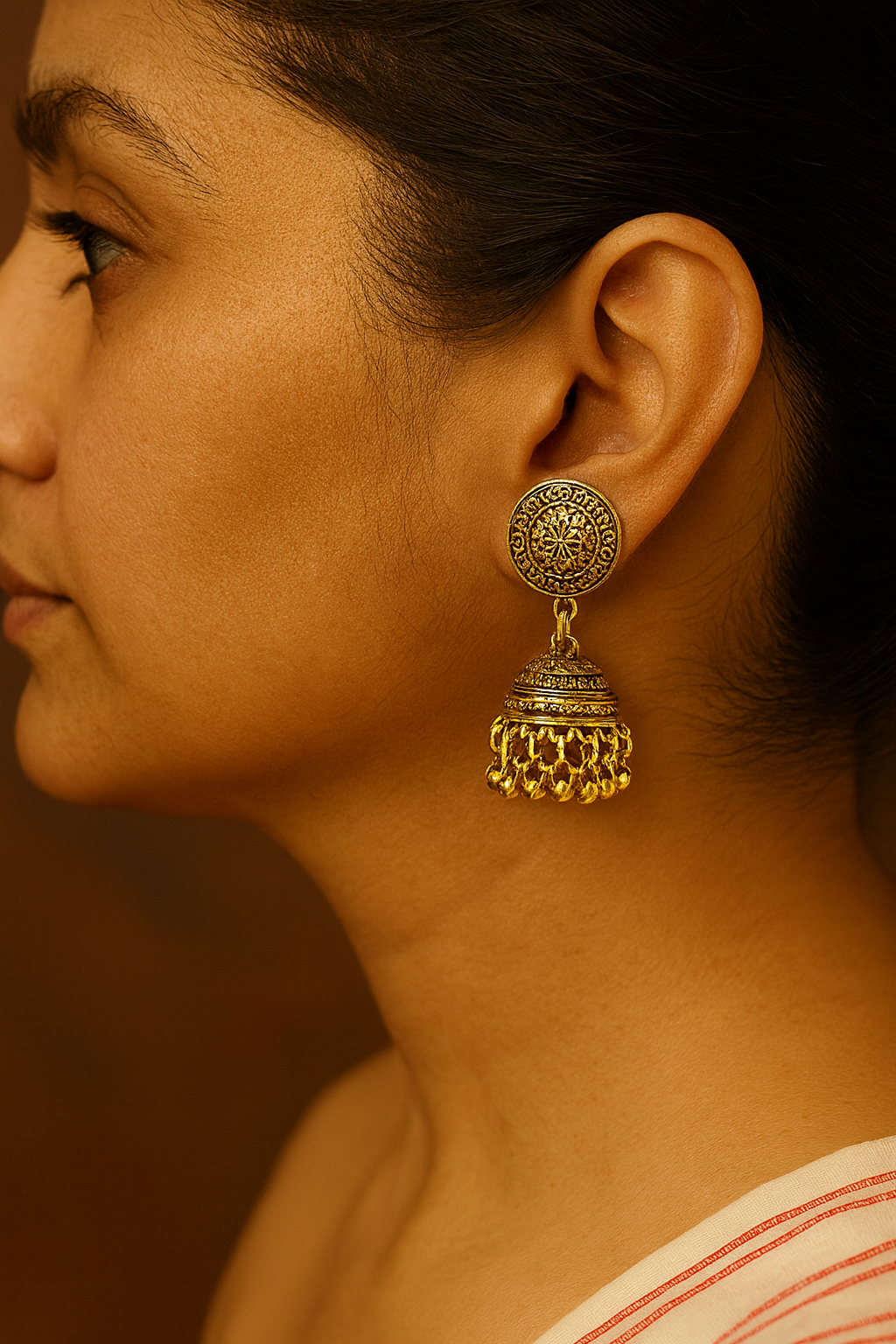 Traditional Gold-Plated Jhumka Earrings – Intricate Filigree with Hanging Beads